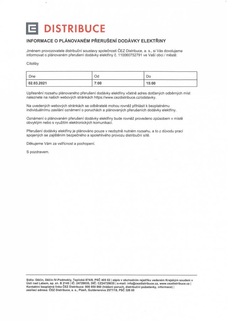 Upozorňujeme na odstávku dodávky elektřiny 2. března 2021. V příloze je seznam č.p., kterých se bude odstávka týkat.